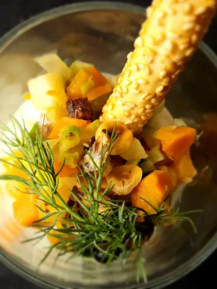 - Geröstete Blumenkohlcreme / Wurzelgemüse
